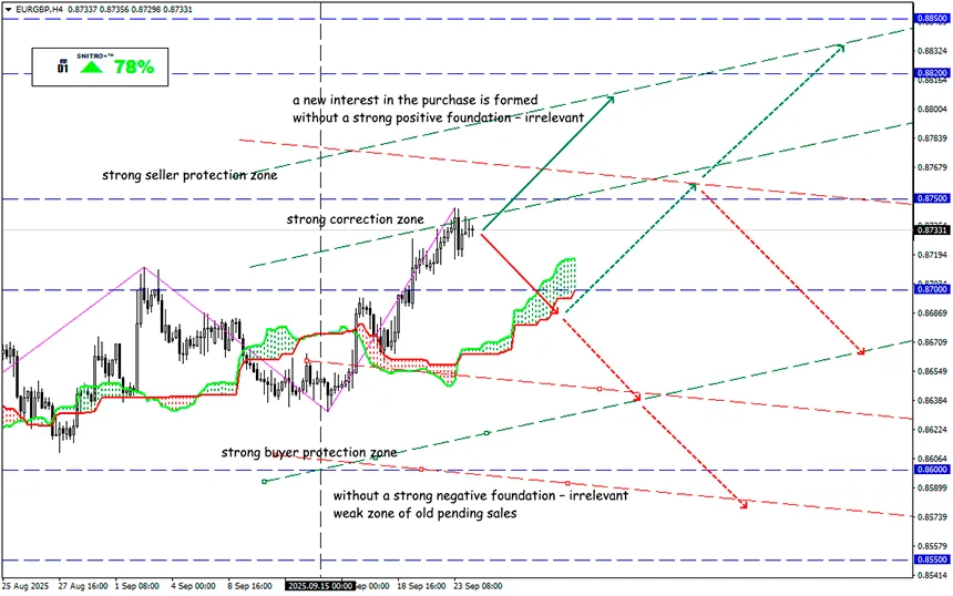 يبقى الطلب على EUR/GBP نشطًا. في الخطوة التالية، قد يختبر المضاربون مستويات 0.8760–0.8770 ويتقدمون أبعد، حيث يتراكم اهتمام تداول جديد. فقدان الدعم عند 0.8720 سيؤدي إلى هبوط نحو 0.8700–0.8680، لكن هذا السيناريو يبدو غير مرجح حاليًا.