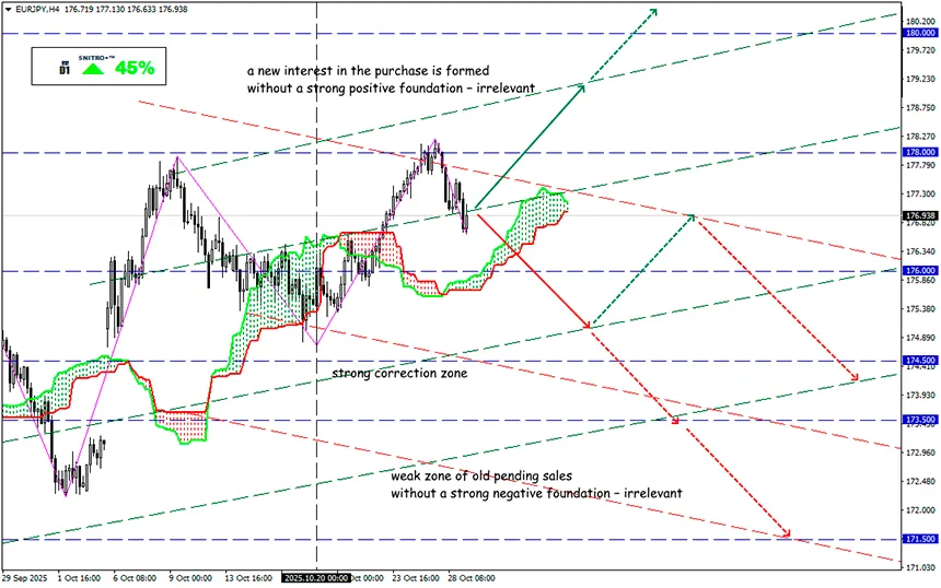 Sell: 176.00 (pada pullback setelah koreksi ke 176,80) ; target 174.50; StopLoss 176.50